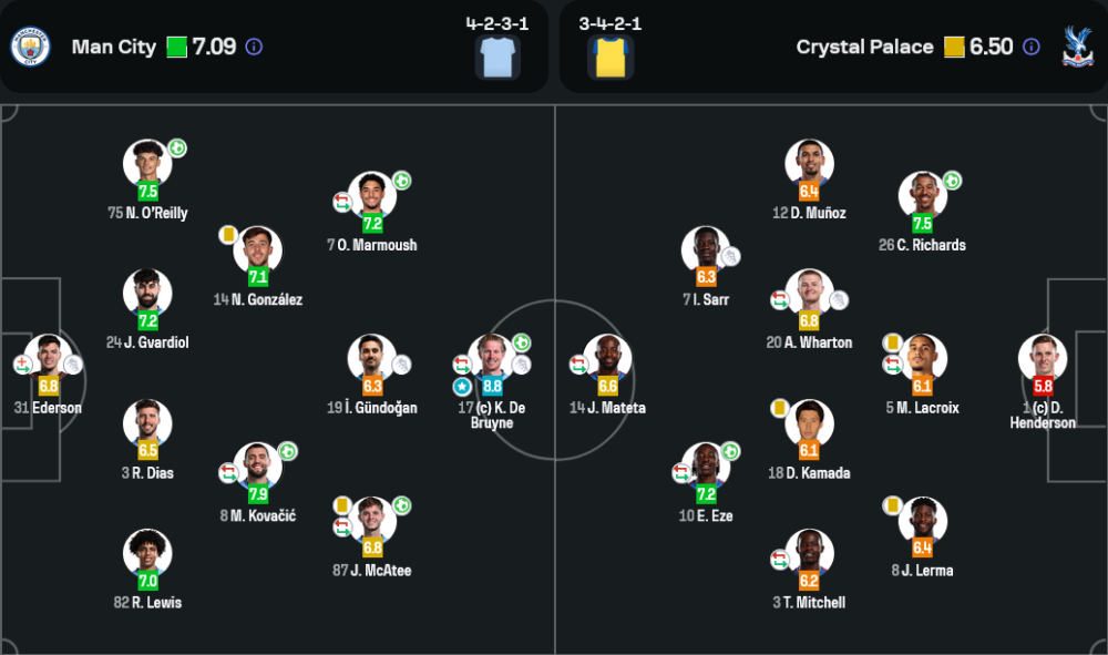 กองหลัง: ลูอิส (7.0), รูเบน ดิอาส (6.5), กวาร์ดิโอล (7.2), โอเรลลี่ย์ (7.5)