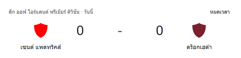 - หมดเวลา: เซนต์ แพตทริคส์ 0-0 ดร็อกเฮด้า ยูไนเต็ด