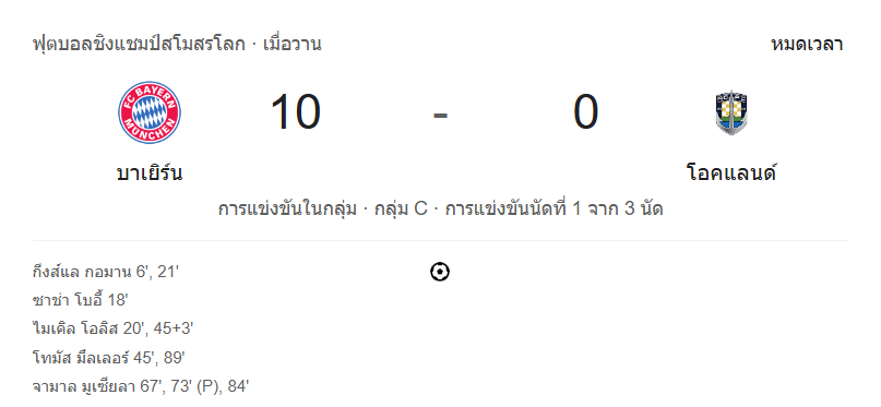 - นาทีที่ 90+6: หมดเวลาการแข่งขัน บาเยิร์น มิวนิค 10-0 โอคแลนด์ ซิตี้