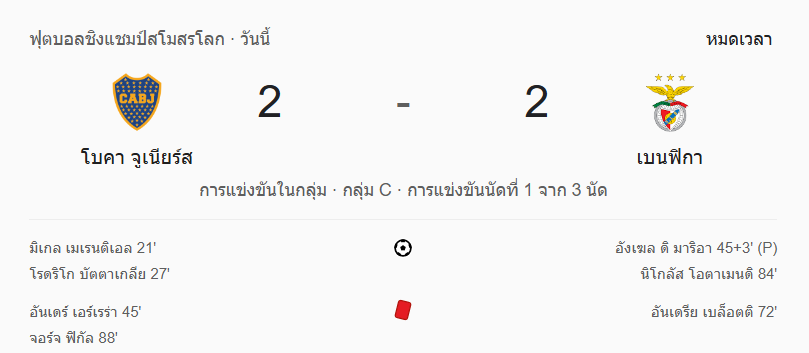 - จบครึ่งแรก: โบคา จูเนียร์ส 2-1 เบนฟิกา