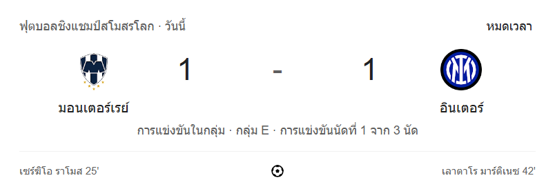 เปิดฉากบู๊ระอุ! ผลบอลสด ศึกฟีฟ่าคลับเวิลด์คัพ กลุ่ม E ระหว่าง มอนเตร์เรย์ พบ อินเตอร์ มิลาน จบลงแบบสุดมันส์ 1-1 ในเกมที่ความเข้มข้นระดับเวิลด์คลาส ทั้งสองทีมต่างไม่มีใครยอมใคร นี่คือเกมที่แฟนบอลต้องจดจำ!