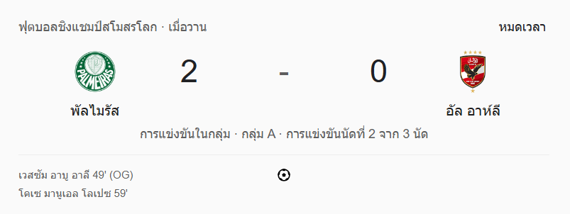 ผลบอลสด ฟีฟ่าคลับเวิลด์คัพ ชิงแชมป์สโมสรโลก ระหว่าง พัลไมรัส 2-0 เอล อาห์ลี วันนี้ 19/6/68