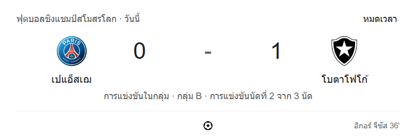 บ้านกีฬา รายงานผลการแข่งขันฟุตบอล ฟีฟ่าคลับเวิลด์คัพ ชิงแชมป์สโมสรโลก กลุ่ม B นัดที่ 2 แบบเข้มข้น เร้าใจ เน้นคีย์เวิร์ด “ผลบอล” เพื่อให้แฟนบอลสายวิเคราะห์ไม่พลาดทุกช็อตเด็ด โดย ปารีส แซงต์ แชร์กแมง เปิดบ้านรับมือ โบตาโฟโก้ อาร์เจ และต้องพ่ายไปแบบสุดมันส์ 0-1 โดนทีเด็ด “อีกอร์ จีซัส” ซัดประตูชัยสุดเฉียบคม