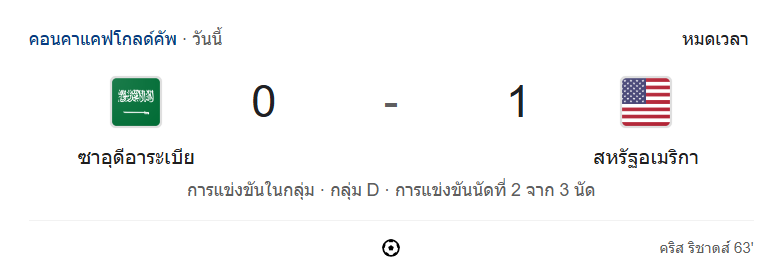 - นาทีที่ 98: หมดเวลาการแข่งขัน ซาอุดีอาระเบีย 0-1 สหรัฐอเมริกา
