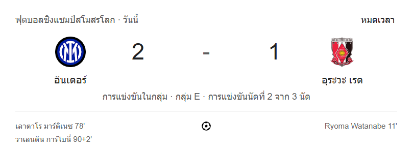 ศึกฟีฟ่าคลับเวิลด์คัพ ชิงแชมป์สโมสรโลก นัดมันส์ระหว่าง อินเตอร์ มิลาน พบ อูราวะ เรด ไดมอนส์ จบลงด้วยชัยชนะสุดระทึกของงูใหญ่อินเตอร์ 2-1 พร้อมคีย์เวิร์ดยอดฮิตอย่าง “ผลบอลสด” ที่สาวกฟุตบอลต้องไม่พลาด ติดตามครบทุกจังหวะสำคัญที่นี่ บ้านกีฬา!
