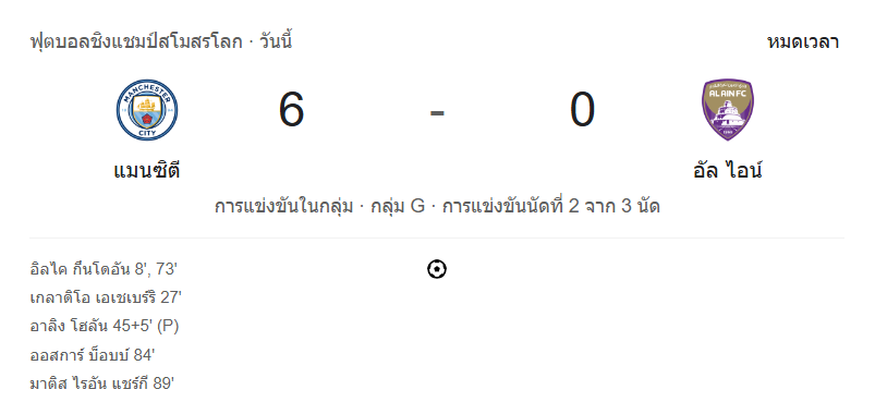 - หมดเวลา: แมนเชสเตอร์ ซิตี้ถล่ม อัล ไอน์ 6-0 แบบเหนือชั้นทุกจังหวะ