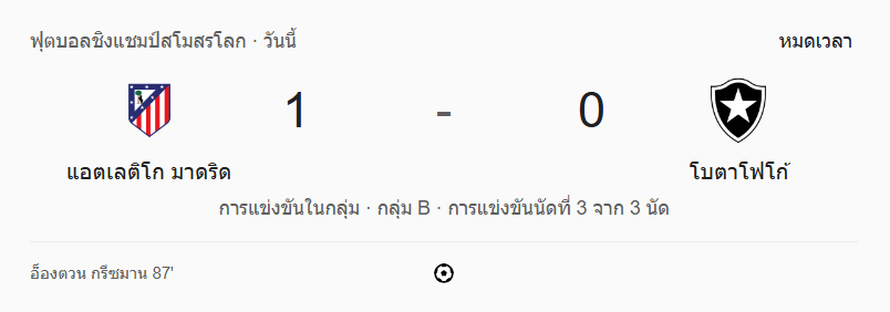 - หมดเวลา: แอตเลติโก มาดริดเปิดบ้านเฉือนโบตาโฟโกไป 1-0 ในเกมที่ทั้งสองทีมเปิดหน้าแลกกันสนุก ยิงกันทั้งสองฝั่ง แต่สุดท้ายเป็นลูกยิงของกรีซมันน์ที่ตัดสินเกม!
