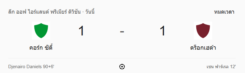 ผลบอลสด ไอร์แลนด์ พรีเมียร์ ลีก ระหว่าง คอร์ก ซิตี้ 1-1 ดร็อกเฮด้า ยูไนเต็ด วันนี้ 24/6/68