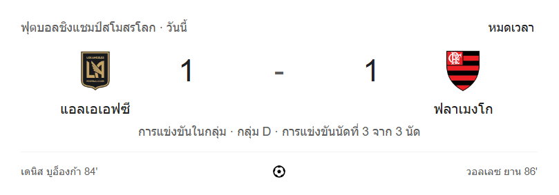 คู่นี้สมศักดิ์ศรีเกมใหญ่ ลอส แอนเจลิส เอฟซี 1-1 ฟลาเมงโก ต่างฝ่ายต่างมีช่วงเวลาของตัวเองและมีโอกาสเด็ดขาดให้ได้ลุ้นตลอด 90 นาที ผลเสมอนี้ส่งผลให้ฟลาเมงโกเข้ารอบในฐานะแชมป์กลุ่ม D ส่วนแอลเอ เอฟซี ต้องผิดหวังกับการจบอันดับสุดท้าย