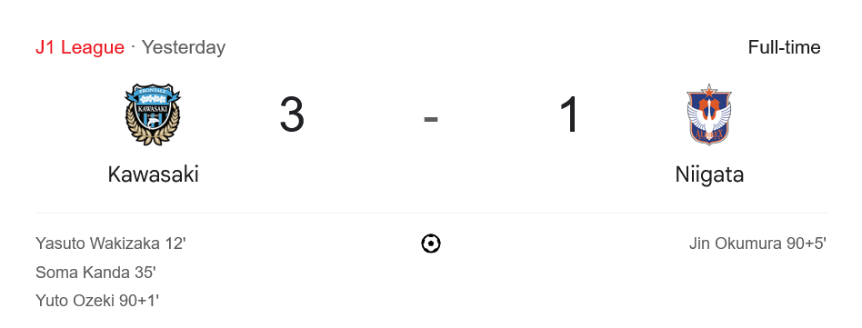 จาก : ผลบอลสด เจลีก ดิวิชัน 1 ระหว่าง คาวาซากิ ฟรอนตาเล่ 3-1 อัลบิเร็กซ์ นิงาตะ วันนี้ 25/6/68 – บ้านกีฬา