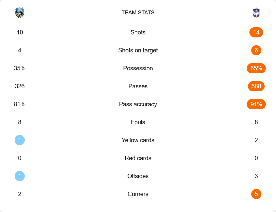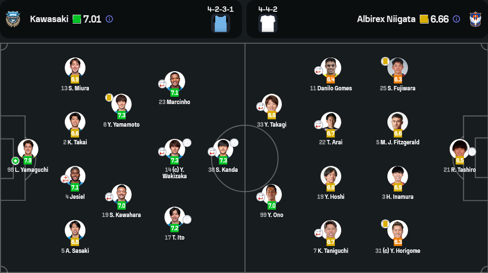 แม้อัลบิเร็กซ์ นิงาตะจะครองบอลถึง 65% และผ่านบอลได้มากถึง 588 ครั้งด้วยความแม่นยำ 91% แต่กลับเป็นคาวาซากิที่เฉียบคมกว่าในการจบสกอร์ โดยมีโอกาสยิง 10 ครั้งและยิงตรงกรอบ 4 ครั้ง เทียบกับของนิงาตะที่ยิงมากถึง 14 ครั้งแต่ตรงกรอบเพียง 6 หน คาวาซากิยังเล่นเกมสวนกลับได้ดีและแม่นยำในพื้นที่สำคัญ ส่วนจังหวะฟาวล์และใบเหลืองถือว่าใกล้เคียงกัน