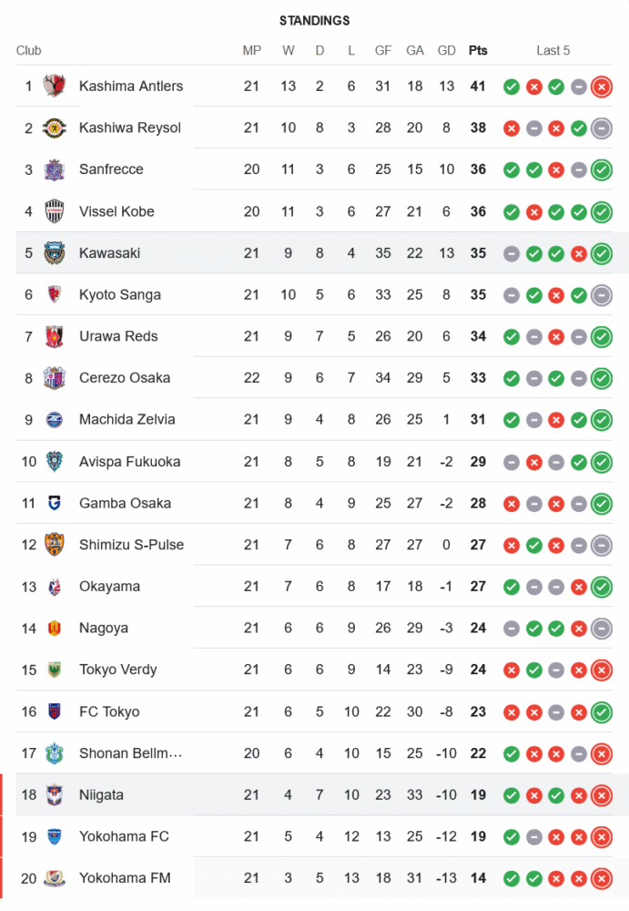 ชัยชนะนัดนี้ทำให้คาวาซากิขยับขึ้นมาอยู่อันดับ 5 ของตาราง เก็บเพิ่มเป็น 35 คะแนน ไล่จี้กลุ่มหัวตารางแบบกระชั้นชิด มีแต้มเท่ากับเกียวโต ซังงะ อันดับ 6 ส่วนอัลบิเร็กซ์ นิงาตะ ยังคงจมอยู่ในโซนท้ายตารางที่อันดับ 18 มีเพียง 19 คะแนน และเสี่ยงต่อการตกชั้นอย่างต่อเนื่องหากฟอร์มไม่กระเตื้อง