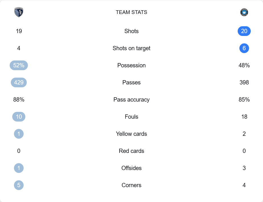 เกมนี้สูสีกว่าที่สกอร์สะท้อน แคนซัส ซิตี้ มีโอกาสยิง 19 ครั้ง เข้ากรอบ 4 ครั้ง ส่วนชาร์ลอตต์ยิงถึง 20 ครั้ง เข้ากรอบ 6 ครั้ง แม้ทีมเยือนจะได้ยิงมากกว่าแต่จังหวะจบไม่เฉียบคมพอ แคนซัสครองบอลมากกว่าที่ 52% และจ่ายบอลแม่นยำถึง 88% ขณะที่ชาร์ลอตต์แม่น 85% ส่วนฟาวล์รวมกันถึง 28 ครั้ง ฝั่งชาร์ลอตต์โดนไป 2 ใบเหลือง ส่วนแคนซัสได้แค่ 1 ใบ เกมนี้เดือดแต่ไม่รุนแรงเกินควบคุม