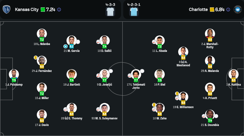 มานู การ์เซีย คือหัวใจของแคนซัสเกมนี้อย่างแท้จริง ด้วยคะแนน 8.2 เขาทำเกมได้ลื่นไหลทั้งจ่ายบอลแม่นยำ เคลื่อนที่ฉลาด และที่สำคัญคือเป็นคนจ่ายบอลให้เมสัน ทอย ยิงตีเสมอ 1-1 การเคลื่อนไหวของเขาทำให้แผงมิดฟิลด์ชาร์ลอตต์ต้องทำงานหนักทั้งเกม