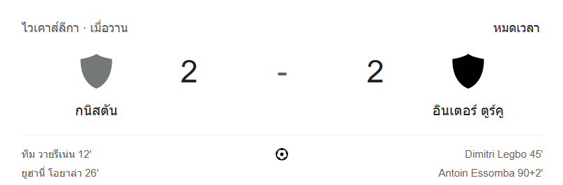 • ทดเวลาบาดเจ็บ:นาทีที่ 90+2: GOAL! อินเตอร์ ตูร์คูตามตีเสมอได้สำเร็จ อองตวน เอสซอมบ้า ซัดจ่อ ๆ ในเขตโทษ ทำให้สกอร์กลับมาเท่ากัน 2-2
