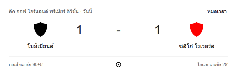 - หมดเวลา: โบฮีเมียนส์ 1-1 สลิโก้ โรเวอร์ส