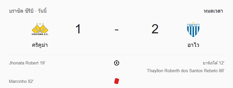 บ้านกีฬา ขอพาทุกท่านเกาะติดขอบสนามกับศึกฟุตบอล คัมปิโอนาโต บราซิเลียโร ซีรีบี ที่ผลบอลสดเมื่อคืนนี้เดือดสุด ๆ เมื่อ คริคูม่า เปิดบ้านรับการมาเยือนของ อาไว เอฟซี เอสซี สุดท้ายกลายเป็นทีมเยือนที่บุกมาคว้าสามแต้มสำคัญไปด้วยสกอร์ 2-1 โดยเกมนี้มีทั้งประตูสุดสวยและใบแดงเปลี่ยนเกมที่คอบอลห้ามพลาด!