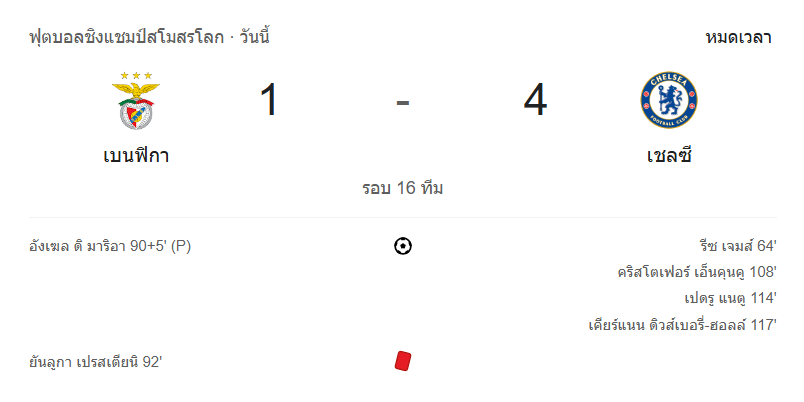 - หมดเวลาการแข่งขัน:เบนฟิกา 1-4 เชลซี เชลซีผ่านเข้าสู่รอบ 8 ทีมสุดท้ายอย่างยอดเยี่ยม!