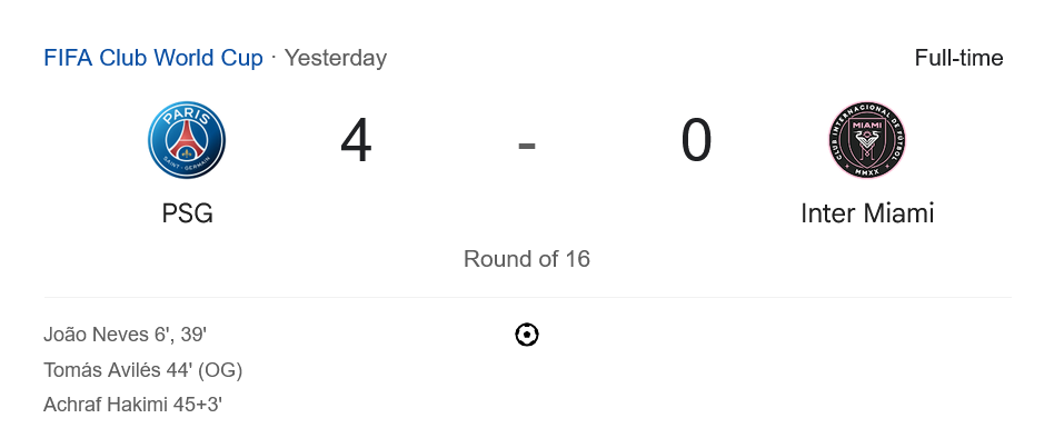 ศึกฟุตบอล ฟีฟ่า คลับ เวิลด์คัพ รอบ 16 ทีมสุดท้าย ที่แฟนบอลทั่วโลกต่างจับตา เมื่อค่ำคืนวันที่ 29 มิถุนายนที่ผ่านมา ได้บทสรุปชัดเจนว่า ปารีส แซงต์-แชร์กแมง หรือ เปแอสเช โชว์ฟอร์มระดับเวิลด์คลาสไล่บดขยี้ อินเตอร์ ไมอามี่ แบบไม่ปรานีถึง 4-0 พร้อมตีตั๋วเข้าสู่รอบก่อนรองชนะเลิศอย่างสมศักดิ์ศรี