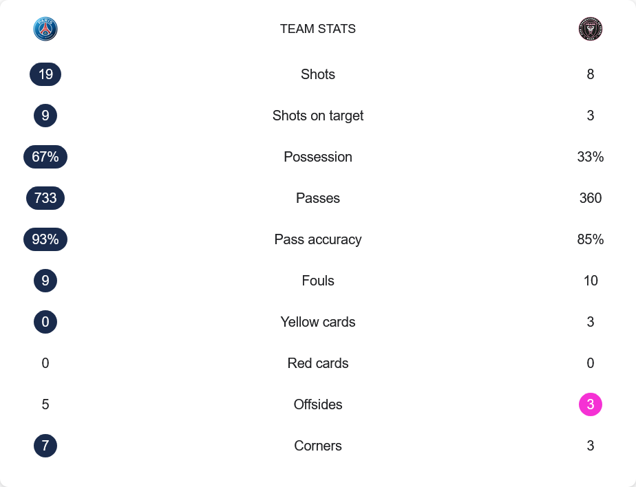 เปแอสเชครองบอลสูงถึง 67% มีโอกาสยิงทั้งหมด 19 ครั้ง เข้ากรอบ 9 ครั้ง ขณะที่อินเตอร์ ไมอามี่ได้ยิงเพียง 8 ครั้ง และตรงกรอบเพียง 3 ครั้ง นอกจากนี้ เปแอสเชผ่านบอลแม่นยำถึง 93% เทียบกับอินเตอร์ที่แม่น 85% ซึ่งบ่งบอกถึงการควบคุมเกมอย่างเบ็ดเสร็จ การทำฟาวล์ของทั้งสองทีมใกล้เคียงกัน (9 ต่อ 10) แต่ฝั่งอินเตอร์โดนไป 3 ใบเหลือง และยังเสียประตูจากความผิดพลาดในแนวรับ