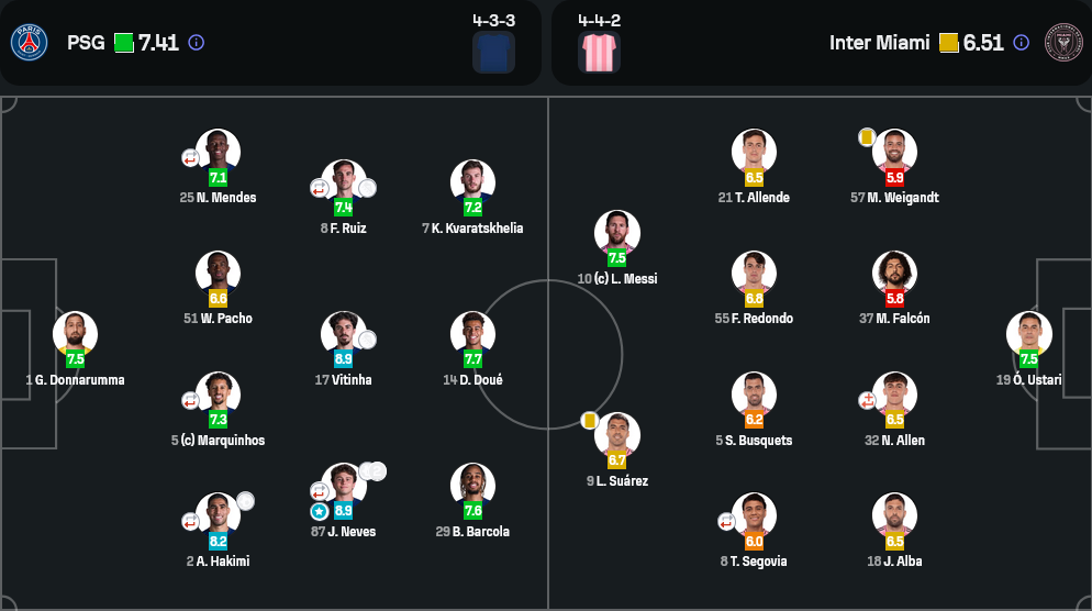 ขณะที่อินเตอร์ ไมอามี่ใช้ระบบ 4-4-2 ที่ดูเหมือนเน้นเกมรับและการสวนกลับผ่านเมสซี่-ซัวเรซ แต่แผงกลางถูกเจาะได้ง่าย และการเซตบอลจากแดนหลังมีปัญหา ทำให้เกมรับโดนกดดันอย่างต่อเนื่อง การครองบอลเพียง 33% ทำให้ไม่สามารถพลิกโอกาสในเกมรุกได้เลย ซึ่งในแง่ วิเคราะห์บอล ถือว่าเปแอสเชเหนือกว่าในทุกมิติ ทั้งคุณภาพผู้เล่น ความเร็วเกม และการตัดสินใจ