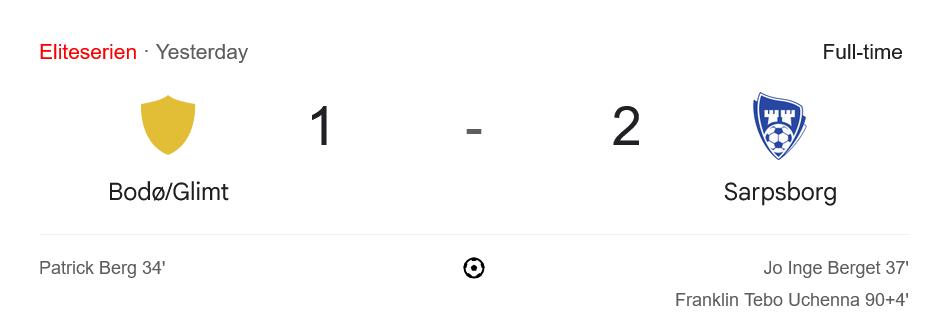 ผลการแข่งขันนี้ทำให้ โบโด/กลิมท์ ยังคงรั้งอันดับ 5 มี 19 คะแนนจาก 10 นัด พลาดโอกาสไล่จี้จ่าฝูงอย่างน่าเสียดาย ส่วน ชาร์ปบอร์ก 08 ขยับขึ้นมาอยู่ที่อันดับ 7 มี 17 แต้มจาก 11 เกม ไล่จี้โซนหัวตารางและกลับเข้าสู่เส้นทางลุ้นพื้นที่ยุโรปอย่างเข้มข้น