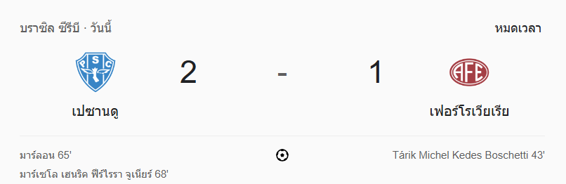 ศึกคัมปิโอนาโต บราซิเลียโร ซีรีบี นัดนี้ “บ้านกีฬา” ขอยกให้เป็นหนึ่งในเกมที่โคตรมันส์สำหรับคนชอบลุ้นผลบอลสด! เมื่อ เอสซี เปซานดูปารา เปิดบ้านคัมแบ็กสุดระห่ำแซงดับ เฟอร์โรเวียเรีย เอสพี 2-1 หลังโดนนำไปก่อน ท่ามกลางเหตุการณ์สำคัญนาทีต่อนาทีที่แฟนบอลนั่งไม่ติดเก้าอี้ สถานการณ์ทั้งสองทีมในตารางก็ยังคุกรุ่น แต้มมีผลอย่างยิ่งต่อการลุ้นหนีโซนอันตราย