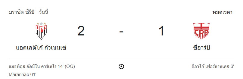 - นาทีที่ 14: GOAL! โชคร้ายของซีอาร์บี มาร์เชลินโญ่ (กัวเนนเซ่) ยิงไกลชนเสา บอลเด้งไปโดน มาตูส อัลบิโน่ ผู้รักษาประตูซีอาร์บีเข้าประตูตัวเอง สกอร์กลับมาเสมอ 1-1