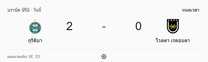 - หมดเวลา: คูริทิบา 2-0 โวลตา เรดอนดา