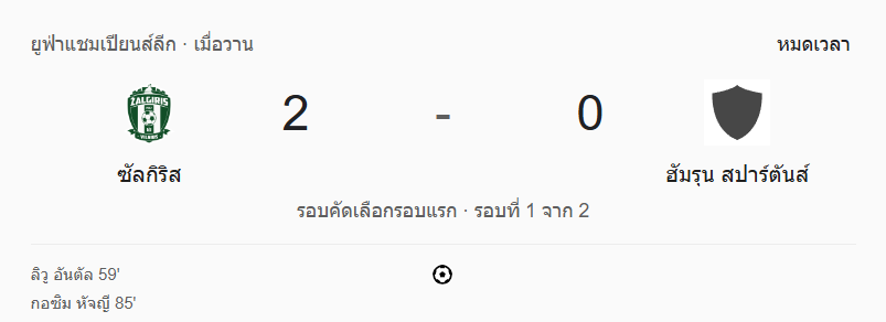 ผลบอลสด ยูฟ่าแชมเปียนส์ลีก รอบคัดเลือก รอบแรก เลกแรก ระหว่าง ซัลกิริส vs ฮัมรุน วันนี้ 9/7/68 ดูบอลย้อนหลัง คลิปไฮไลท์ ดูบอล ยูฟ่าแชมเปียนส์ลีก รอบคัดเลือก รอบแรก เลกแรก