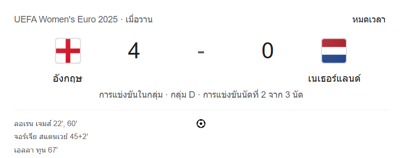 ศึกฟุตบอลหญิงชิงแชมป์แห่งชาติยุโรป (UEFA Women’s Euro 2025) กลุ่ม D “สิงโตสาว” อังกฤษ งัดฟอร์มโหดไล่ถล่ม “อัศวินสีส้ม” เนเธอร์แลนด์ 4-0 ชนิดที่สาวกผลบอลสดต้องลุกขึ้นเชียร์แบบมันสะใจ โดยบ้านกีฬาขอพาไปเจาะลึกทุกจังหวะสำคัญนาทีต่อนาทีของเกมคู่นี้ ที่สนามระอุไปด้วยความเร้าใจ