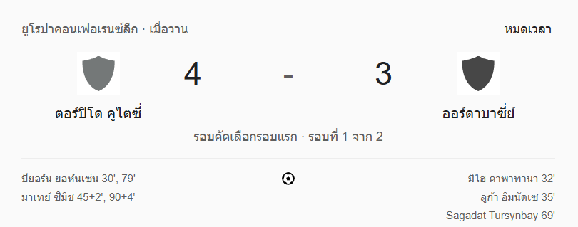 ศึกยูฟ่ายูโรปาคอนเฟอเรนซ์ลีก รอบคัดเลือก รอบแรก เลกแรก ค่ำคืนนี้มันส์ระอุ! บ้านกีฬา ขอสรุป ผลบอล ระหว่าง ตอร์ปิโด คาตูซี่ เปิดบ้านเฉือน ออร์ดาบาซี่ย์ แบบหืดจับ 4-3 ในเกมที่เต็มไปด้วยจังหวะมันส์ ยิงกันสนั่นถึง 7 ประตู ใครพลาดถือว่าต้องเสียใจแน่นอน!