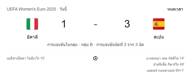 ศึกฟุตบอลหญิงชิงแชมป์แห่งชาติยุโรป 2025 (UEFA Women’s Euro 2025) รอบแบ่งกลุ่ม กลุ่ม B นัดที่ 3 อิตาลี (หญิง) เจอกับ สเปน (หญิง) จบลงด้วยสกอร์ 1-3 สเปนโชว์ฟอร์มโหดบุกเก็บชัย 3 นัดรวด พร้อมซิวแชมป์กลุ่มอย่างสมศักดิ์ศรี บ้านกีฬาเกาะติด ผลบอลสด แบบวินาทีต่อวินาที ให้แฟนบอลไม่พลาดทุกช็อตสำคัญ