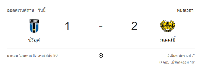 - นาทีที่ 44: Jacob Bergström (มอลล์บี้) ยิงแต่แนวรับซีรีอุสยังบล็อคไว้ได้