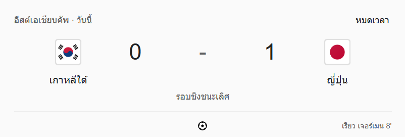 เสียงนกหวีดจบเกมดังขึ้น ญี่ปุ่นเฉือนเกาหลีใต้ 1-0 ในศึกชิงแชมป์เอเชียตะวันออก “ซามูไรบลู” โชว์ความนิ่งเก็บสามแต้มสำคัญ เกมนี้นอกจากความเด็ดขาดของเจอร์เมนแล้ว แผงหลังญี่ปุ่นก็แพ็กเกมได้แน่นหนึบ ขณะที่เกาหลีใต้แม้จะเร่งเครื่องไล่ตีเสมอแต่ก็เจาะตาข่ายไม่เข้า บ้านกีฬาเชื่อว่านี่คือหนึ่งในเกมที่มันส์ ดุเดือด และสมศักดิ์ศรีบอลชิงแชมป์เอเชียตะวันออกอย่างแท้จริง
