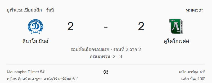 บ้านกีฬา ขอสรุป ผลบอลวันนี้ ดินาโม มินส์ค พลาดท่าในช่วงต่อเวลาพิเศษ โดน ลูโดโกเรต์ส รัซกราด บุกยิงประตูทีมเยือนสุดคม ตีเสมอ 2-2 และผ่านเข้ารอบด้วยกฎประตูทีมเยือน (รวม 3-2) แม้จะสู้สุดใจแต่เจ้าบ้านต้องหยุดเส้นทางเพียงเท่านี้