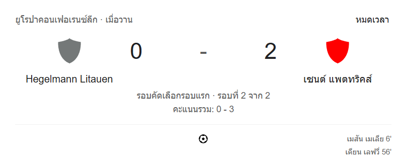 - หมดเวลา: เซนต์ แพตทริคส์ บุกชนะ Hegelmann Litauen 2-0 (สกอร์รวม 3-0) ผ่านเข้ารอบยูโรปาคอนเฟอเรนซ์ลีกต่อไป!