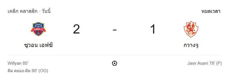 - นาทีที่ 91: GOAL! (OG) Kim Kyeong-Min (กวางจู) สกัดพลาดเข้าประตูตัวเอง! ซูวอนแซงนำ 2-1