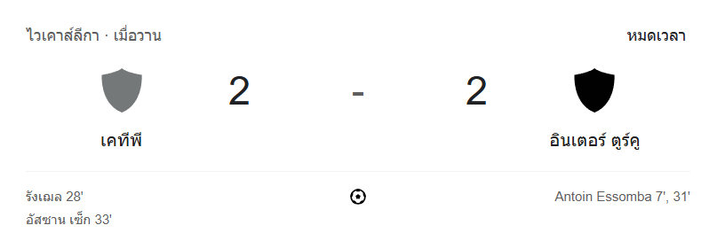 เกมนี้ “บ้านกีฬา” ขอยกให้เป็นแมตช์ ผลบอลสด ที่ดุเดือดเร้าใจ เคทีพี โชว์หัวจิตหัวใจสู้ได้อย่างยอดเยี่ยม ส่วนอินเตอร์ ตูร์คู ก็พิสูจน์ให้เห็นถึงความเฉียบคมของแนวรุก โดยเฉพาะ เอซซอมบา ที่เหมา 2 ประตู สุดท้ายจบลงด้วยผล 2-2 ที่แฟนบอลไม่มีวันลืม