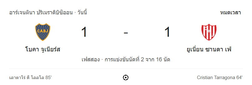 เสียงนกหวีดหมดเวลา “โบคา จูเนียร์ส” เสมอ “ยูเนี่ยน ซานตา เฟ่” 1-1 ใครที่รับชมผ่าน ผลบอลสด บ้านกีฬา คงมันส์สะใจไปกับเกมนี้แน่นอน สองประตูจาก ตาร์รากอน่า นาที 64 และ ดิ โลลโล่ นาที 85 คือไฮไลท์ของค่ำคืนนี้ พร้อมการเปลี่ยนตัว เกมรับแน่น และใบเหลืองอีกหลายใบในช่วงทดเวลา บอกเลยว่าเดือดสมชื่อลีกอาร์เจนติน่า!