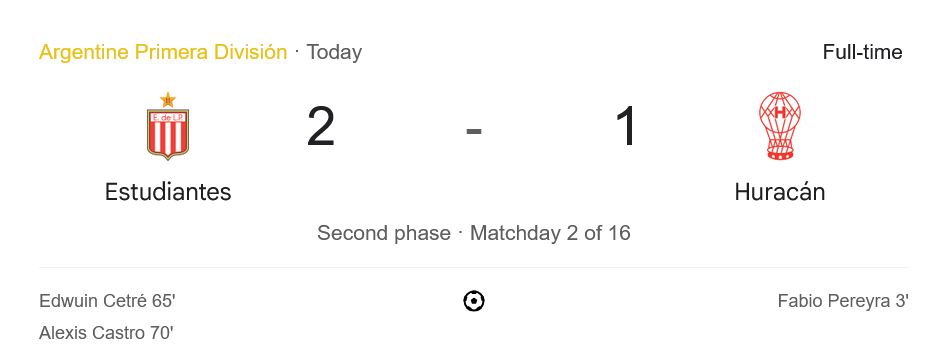 บ้านกีฬา พาแฟนบอลเกาะติด ผลบอลสด แบบสดๆ ร้อนๆ จากเวที อาร์เจนติน่า พรีเมียร์ดิวิชั่น คู่ระหว่าง เอสตูเดียนเตส ลา พลาต้า เปิดบ้านแซงเอาชนะ ซีเอ ฮูราแคน ไปแบบสุดมัน 2-1 หลังจากโดนขึ้นนำเร็วตั้งแต่นาทีที่ 3 เกมนี้เต็มไปด้วยความเข้มข้น ดุดัน และจังหวะปะทะที่ร้อนแรงสมศักดิ์ศรีลีกสูงสุดแดนฟ้าขาว