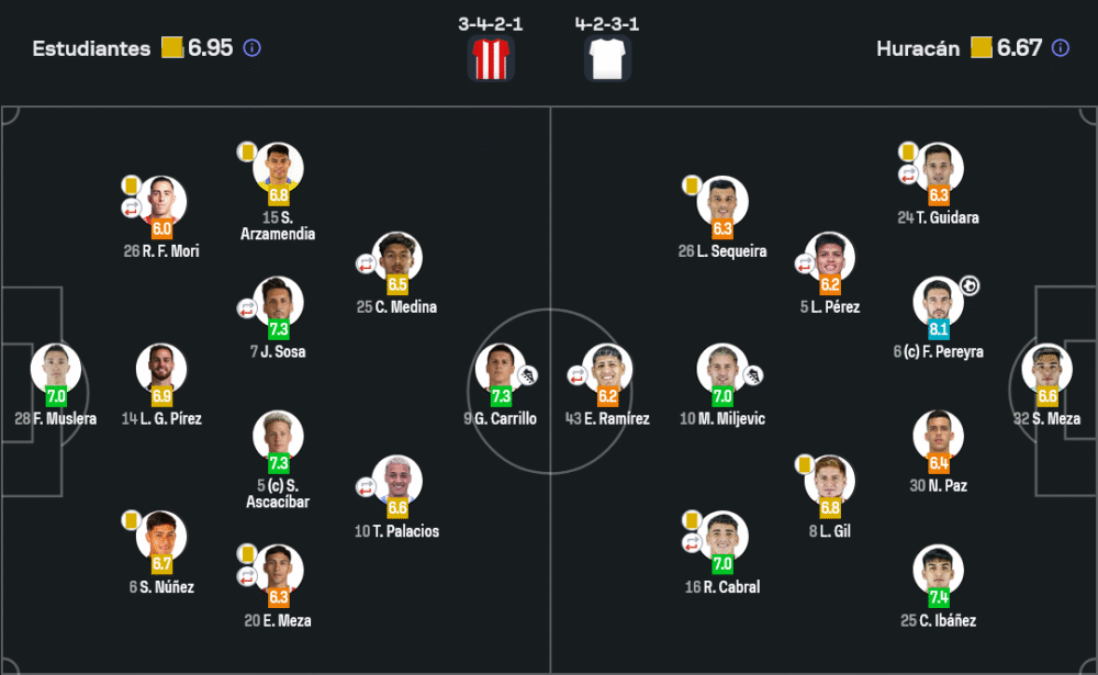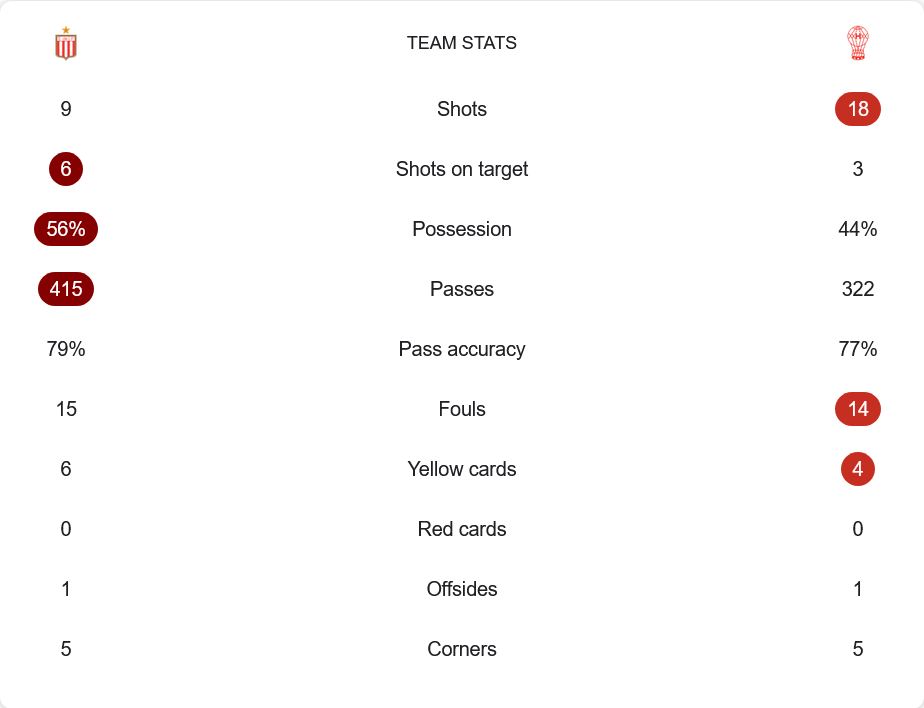 เกมนี้เอสตูเดียนเตสครองบอลมากกว่า 56% สร้างโอกาสยิงได้ 9 ครั้ง เข้ากรอบ 6 ส่วนฮูราแคนครองบอล 44% แต่กลับยิงมากถึง 18 ครั้ง เข้ากรอบเพียง 3 ครั้ง ความแม่นยำการผ่านบอลของเจ้าถิ่นอยู่ที่ 79% ดีกว่าเล็กน้อย และทั้งสองทีมเล่นกันหนักหน่วง มีฟาวล์รวมถึง 29 ครั้งและใบเหลืองรวม 10 ใบ