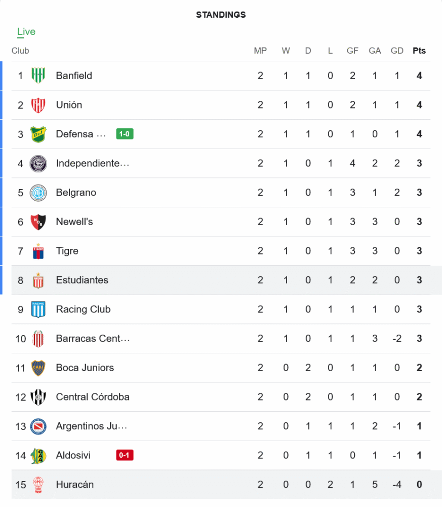 ชัยชนะเกมนี้ทำให้เอสตูเดียนเตสเก็บเพิ่มเป็น 3 แต้มจาก 2 นัด ขึ้นมาอยู่อันดับ 8 ของตาราง ส่วนฮูราแคนยังไม่มีแต้ม รั้งท้ายตารางอันดับ 15 ทำให้สถานการณ์ของทีมเยือนน่าเป็นห่วงไม่น้อย