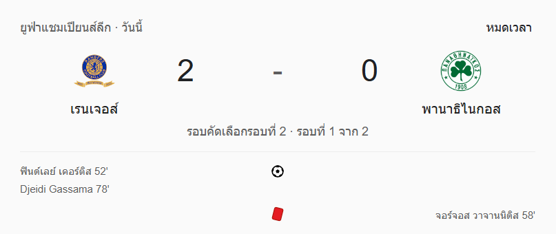 - นาทีที่ 90+1-90+5: พานาธิไนกอสได้ฟรีคิกต่อเนื่อง แต่จบสกอร์ไม่ได้ Diomande (เรนเจอร์ส) มีโอกาสจบเกมแต่ยิงหลุดออกไป