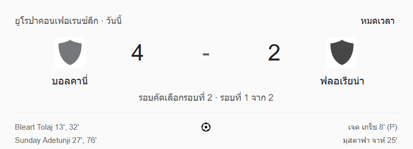 - หมดเวลา: บอลคานี่ 4-2 ฟลอเรียน่า