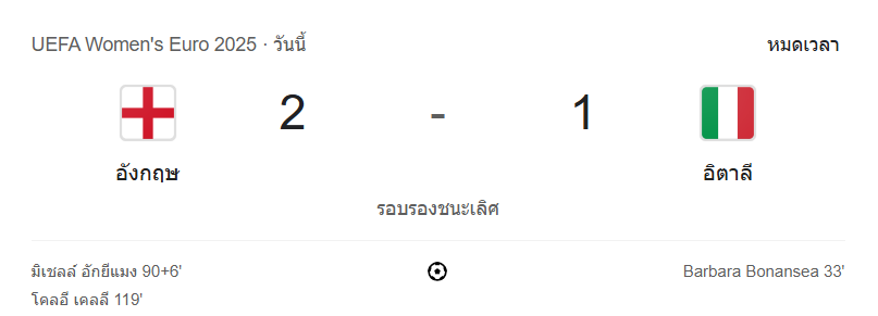 - หมดเวลาการแข่งขัน อังกฤษเฉือนชนะอิตาลี 2-1 ผ่านเข้าสู่รอบถัดไป!