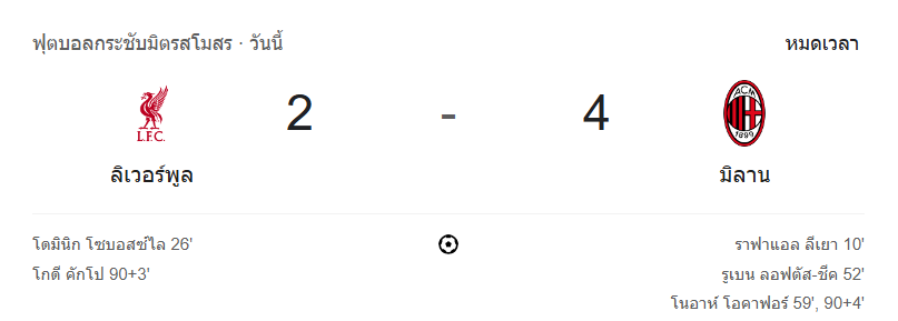 บ้านกีฬา ขอสรุป ผลบอลสด ว่าแมตช์นี้มิลานโชว์ของจริง เกมรุกจัดจ้าน คมกริบทุกจังหวะ ลิเวอร์พูลแม้จะพยายามไล่ตีตื้นแต่สุดท้ายไม่อาจต้านทานความโหดของทีมเยือนได้ เสียงเฮเต็มสนาม แต่แฟนหงส์คงต้องกลับไปลุ้นกันต่อในแมตช์ถัดไป