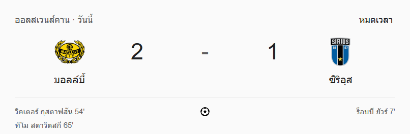 จบ 90 นาที มอลล์บี้ เอไอเอฟ เปิดบ้านเฉือน ไอเคซิริอุสเอฟเค 2-1 ด้วยหัวใจนักสู้และความเด็ดขาดในช่วงเวลาสำคัญ ประตูจาก วิกเตอร์ กุสตาฟสัน และ ติโม่ สตาวิตสกี้ คือจุดเปลี่ยนเกมที่แท้จริง ด้านซิริอุส แม้เริ่มได้สวยแต่เกมรับและจังหวะจบสกอร์ในครึ่งหลังไม่เฉียบพอ ต้องกลับบ้านมือเปล่า