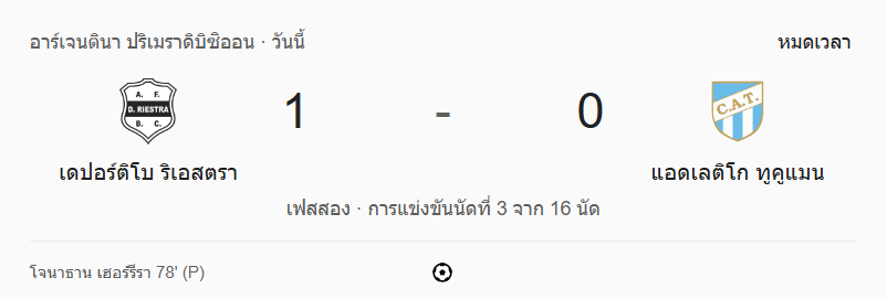- นาทีที่ 97: จบเกม! เดปอร์ติโบ ริเอสตรา เปิดบ้านเฉือนชนะ แอตเลติโก ทูคูแมน 1-0 จากประตูโทนของโจนาธาน เฮอร์เรร่า พาทีมคว้า 3 คะแนนสำคัญในบ้านได้สำเร็จ