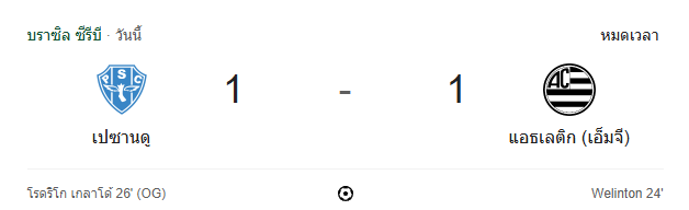 ศึกฟุตบอล คัมปิโอนาโต บราซิเลียโร ซีรีบี เมื่อคืน เปซานดู เปิดบ้านรับมือ แอธเลติก เอ็มจี และจบด้วยผลเสมอ 1-1 ที่เต็มไปด้วยเหตุการณ์ดราม่าร้อนระอุ ติดตามทุกจังหวะสำคัญและสกอร์แบบ ผลบอลสด ได้ที่นี่ บ้านกีฬา!